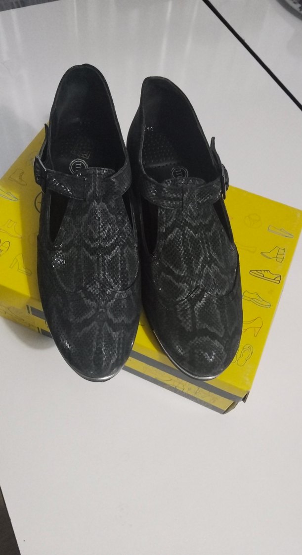 Siyah yılan deseni ve tokalı detaylı, blok topuklu kadın düz ayakkabı. Dayanıklı kauçuk malzemeden üretilmiştir, günlük kullanım için uygundur. hiç kullanılmadı orjinal kutusuyla gonderilcek