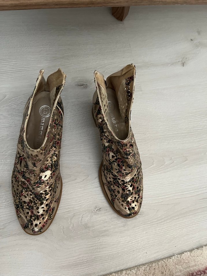 Kahverengi yılan desenli tekstil üstü, payet detaylı dolgu topuklu bohem tarz botlar. Günlük kullanıma uygundur. Hiç bir defosu yoktur