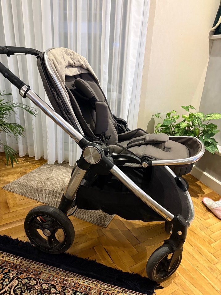 Ocarro modeli. Gri renkli bebek arabası, sağlam çerçeve, rahat yastıklı oturma alanı ve büyük tekerleklerle kolay hareket sağlar.