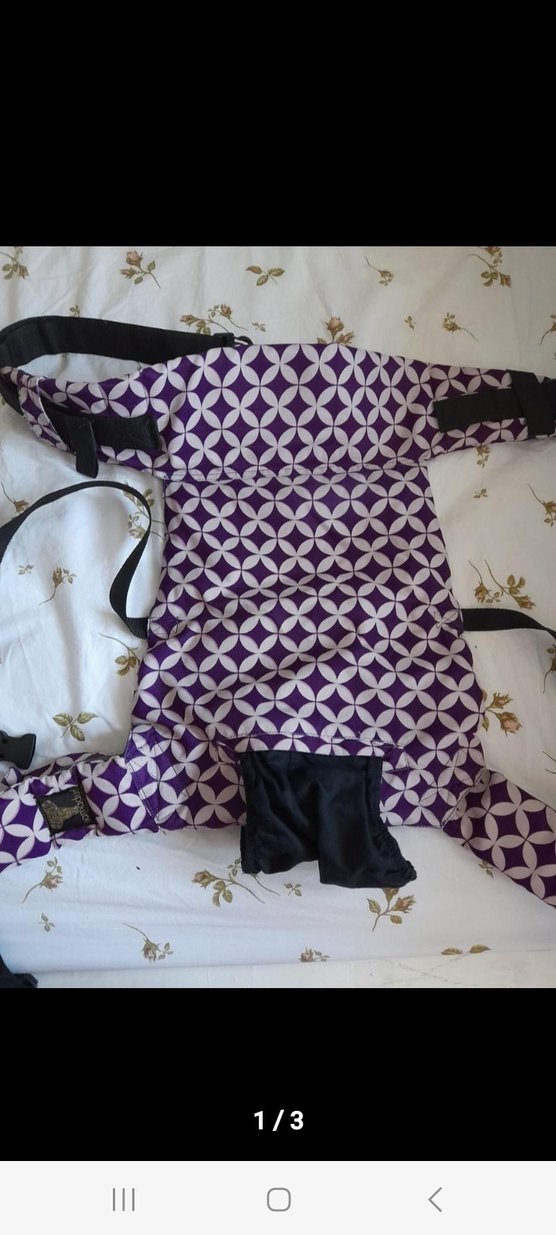 Geometrik beyaz desenli koyu mor bebek taşıyıcı, ayarlanabilir kayışlarla güvenli ve rahat kullanım sağlar.