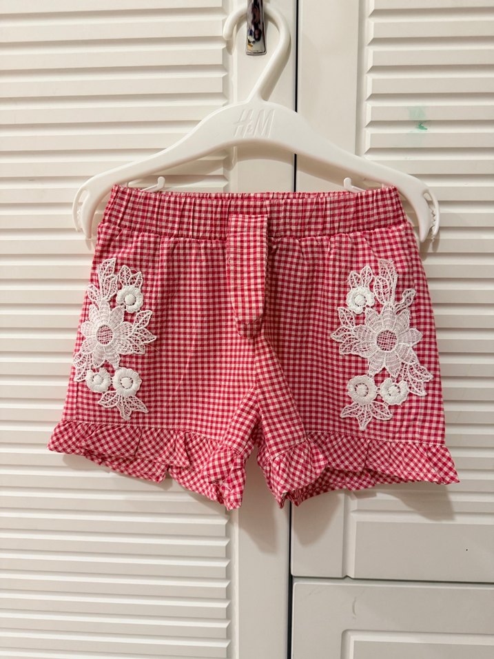 Yumuşak pamuklu, kırmızı kareli kumaştan, yanlarda nakışlı çiçek desenli dantel detaylı, bol kesim kız çocuk şort. Beli lastiklidir.