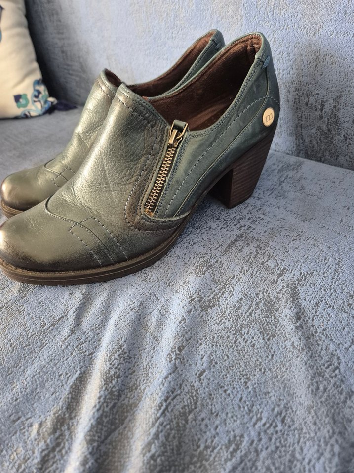 Gri deri kadın botlar, blok topuklu ve tokalıdır. Vintage ve modern tarzı günlük kullanıma uygundur.