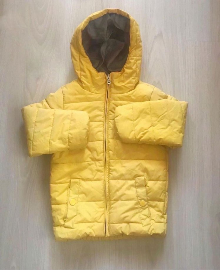 Sarı kapüşonlu, fermuarlı, erkek çocuk montu.