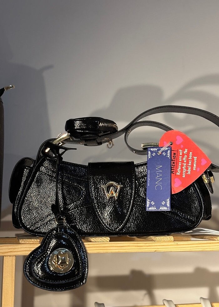 Toz torbası ile birlikte gönderilir. Ayarlanabilir askı Altın tonlu detaylar Askı da dekoratif cep Özel HEART CHARM aksesuarlı Manc logolu iç cep