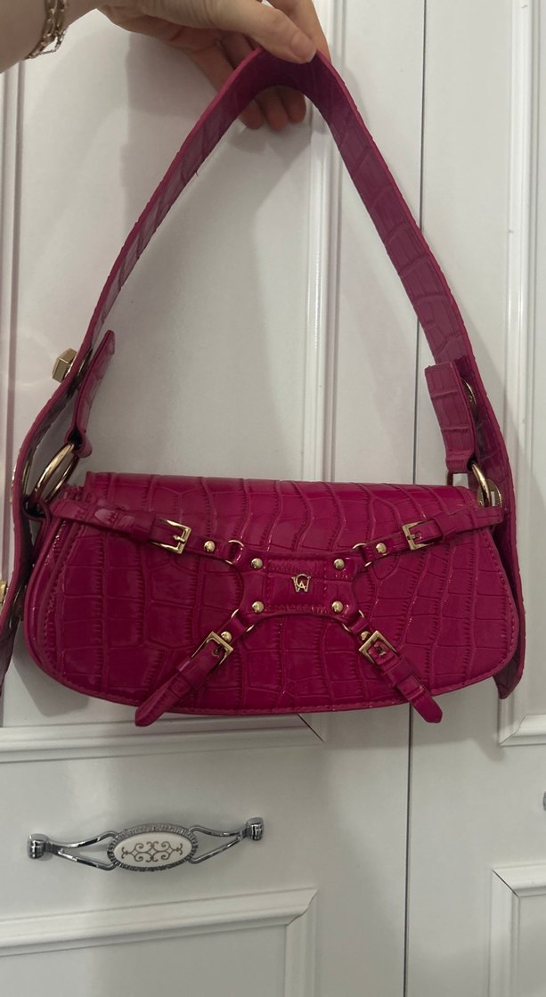 Parlak pembe deri çanta, krokodil desenli ve tokalı detaylara sahip. Cesur sokak stili ve romantik akşamlar için uygun.