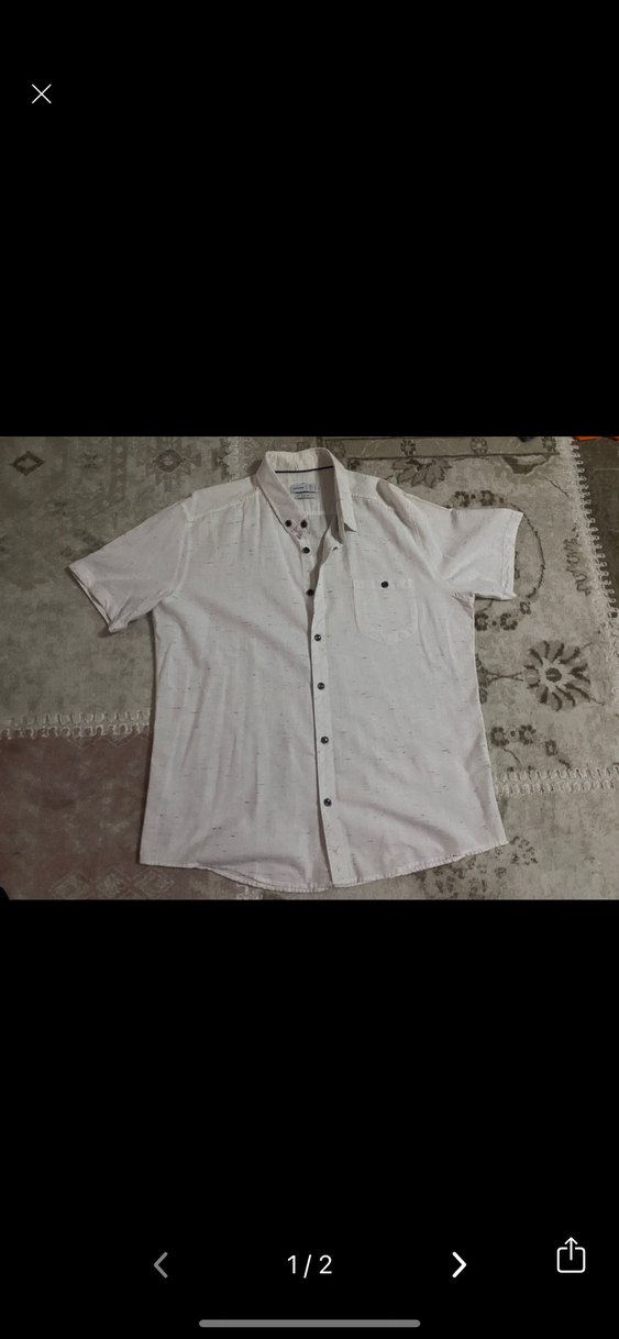 Erkekler için beyaz, kısa kollu, pamuklu gömlek. Düğmeli ve yakalı, tek cep detaylı, rahat kesim ve normal boyda.