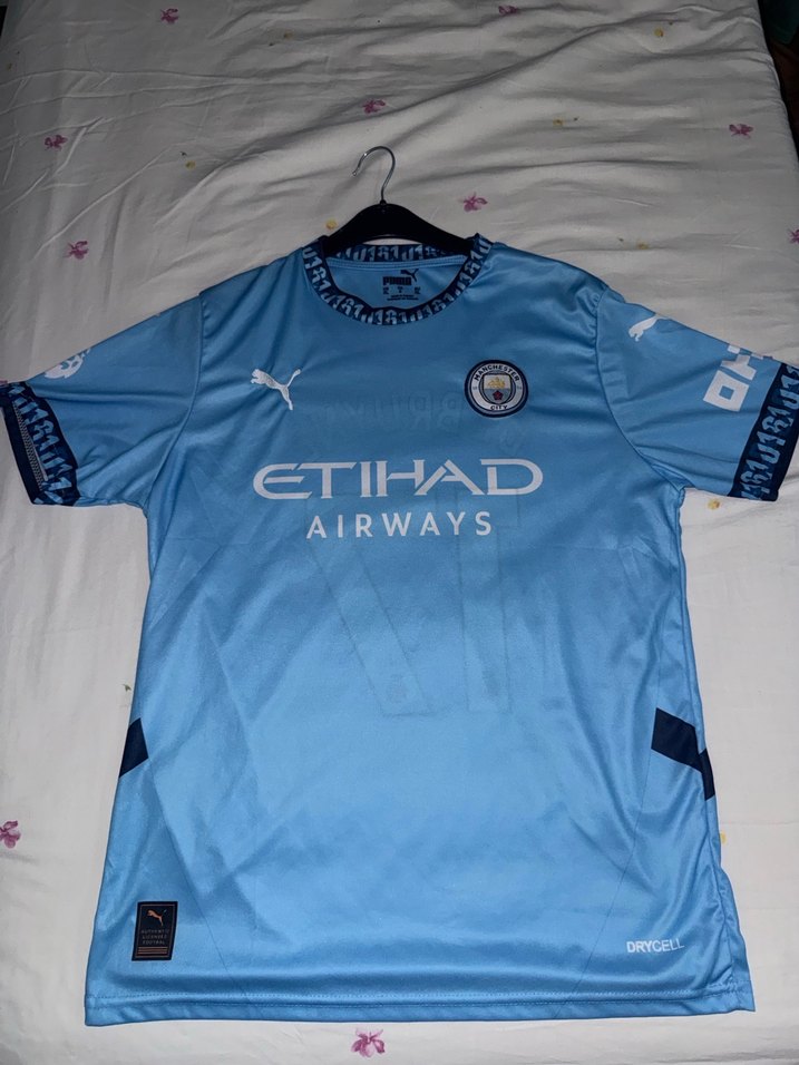 Erkekler için kısa kollu, yakalı ve vücuda oturan kesime sahip mavi futbol forması. Sentetik kumaştan, baskılı "ETIHAD AIRWAYS" logolu, düğmeli detaylı, günlük sokak stiline uygun. ⚽