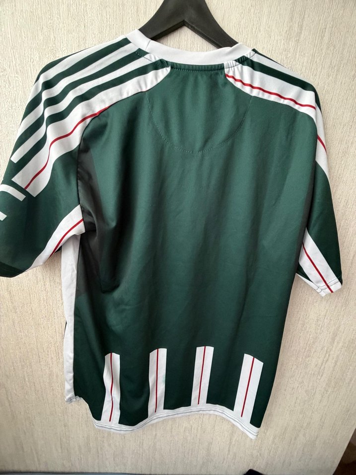 Düğmeli, V yaka kısa kollu erkek tişörtü, sentetik kumaştan, koyu yeşil renkte, beyaz ve kırmızı çizgili detaylarla spor ve rahat stil sunar. hiç kullanılmadı