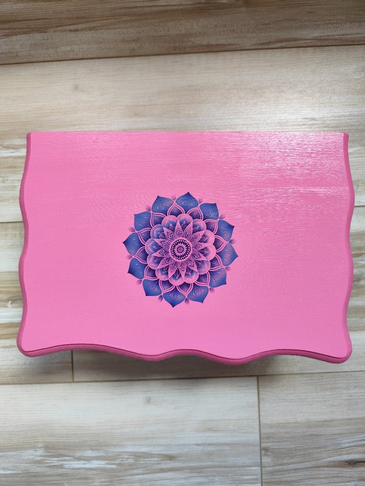 Pembe - Mavi renkli, mandala desenli ahşap kutu ✨ Mandala motifi sulu transfer tekniği ile yapılmıştır. El boyamasıdır ️
