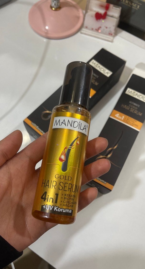 Mandila Gold 4'ü 1 arada saç serumu; keratin, biotin, kollajen ve argan yağı ile UV koruması sağlar.