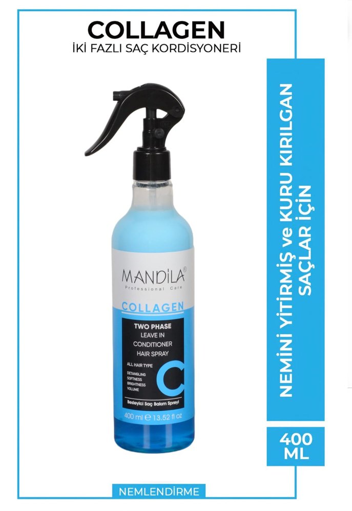 Mandila Kolajen iki fazlı saç kremi spreyi, kuru ve kırılgan saçları nemlendirir, yumuşaklık ve hacim kazandırır. 400 ml.