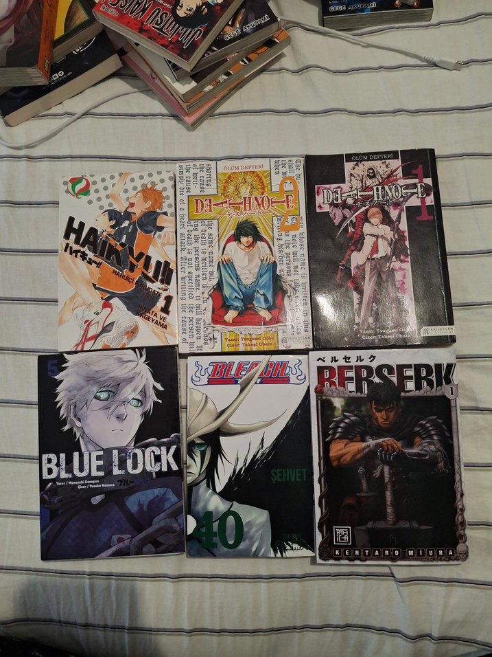 fiyat sorun !!!!!! bunu almayin !!! blue lock cilt 1 death note 1 ve 2 haikyu 1 bleach 40 berserk 1 death note olanlar biraz hasarli, egilip bukulduler