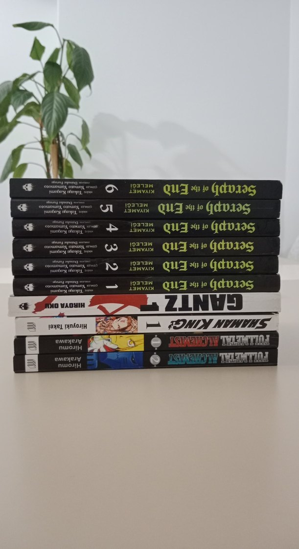 'Seraph of the End' serisi ve 'Gantz', 'Shaman King', 'Full Metal Alchemist' gibi çizgi romanlardan oluşan manga seti. Hepsi de temiz. Profilimden diğer kitaplara da bakabilirsiniz.