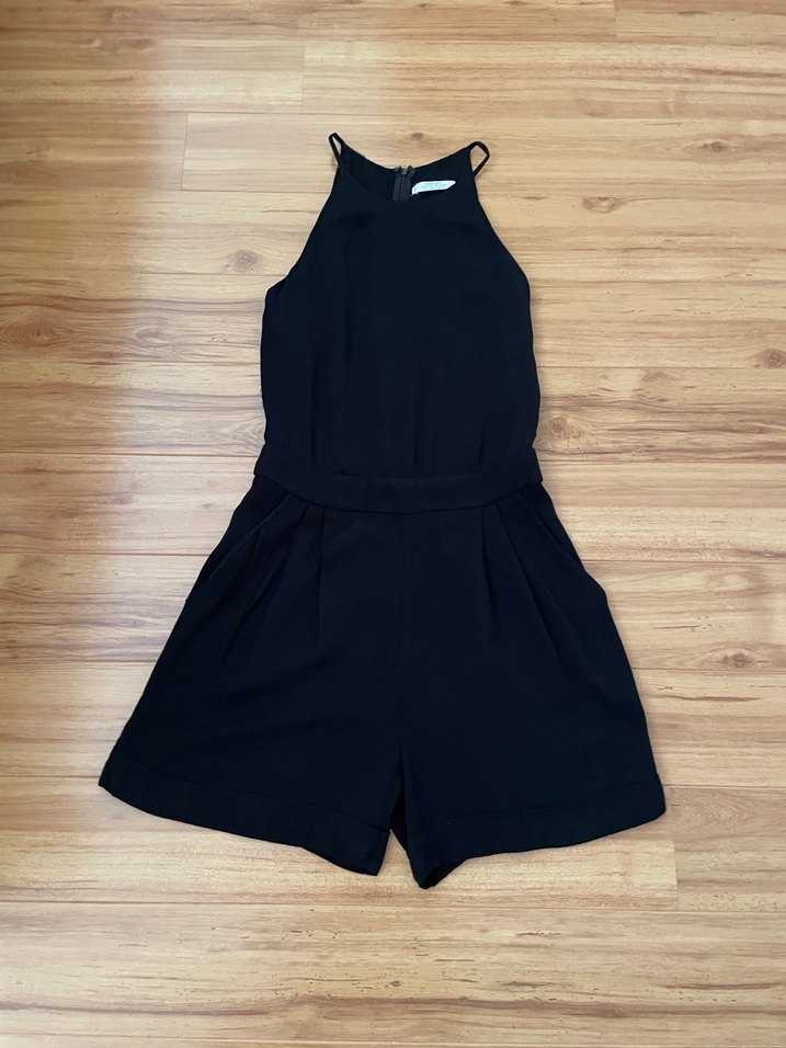 Siyah, kolsuz mini tulum, yüksek yakalı ve bol kesimli, ipeksi kumaştan. Romantik akşamlar için şık ve rahat bir tercih.