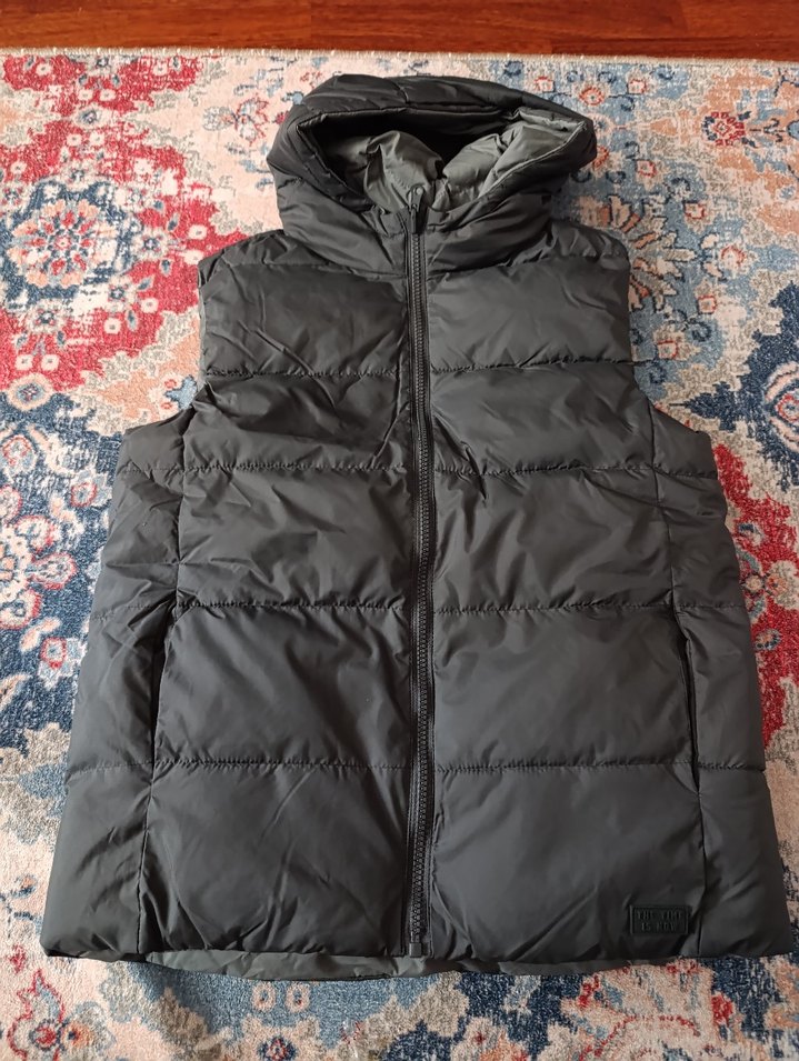 Yumuşak sentetik kumaştan, kapüşonlu ve fermuarlı, kolsuz cif tarafli yelek. Normal boyda, vücuda oturan kesimiyle günlük kullanıma uygun.