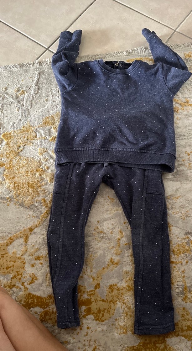 Fitted kesim, uzun kollu ve bisiklet yaka bebe kız takımı, yumuşak pamuklu dokusuyla lacivert ile indigo mavi ortası renkte, noktalı deseniyle trend bir görünüm sunar.alt eşofmanın arka kısmında renk solması ve salıncağa takılma sonucu bi delik olmuştu elimde dikmiştim. Tekrar dikilebilir. Ben severek giydirdim. Günlük kullanım için uygun