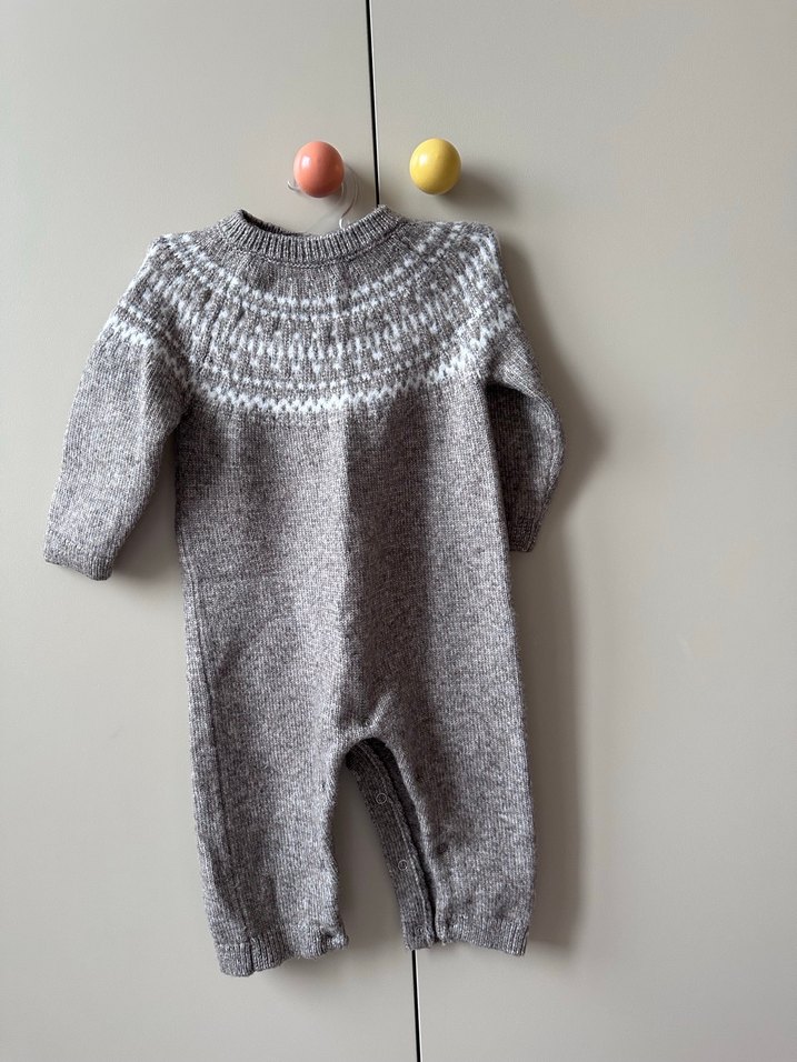Açık kahve renkli, yumuşak örgü kumaştan yapılmış, yuvarlak yaka ve uzun kollu bebek tulumu. Minimal desenli, normcore tarzında. 1 defa giyildi