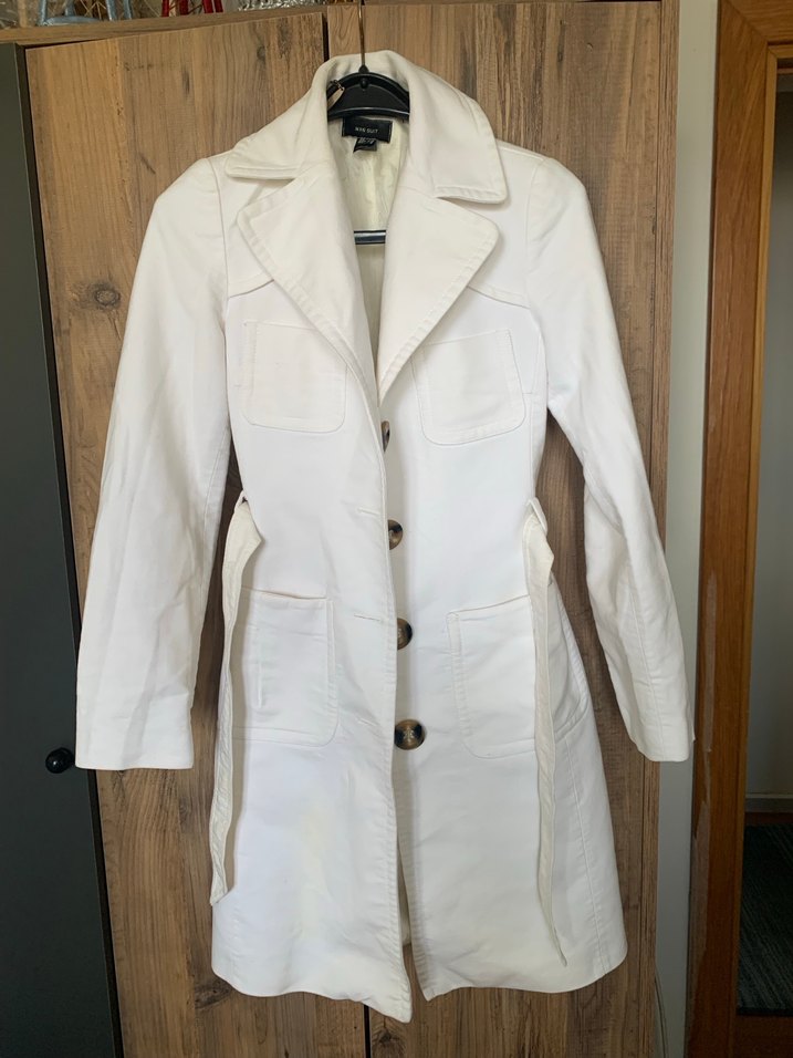 Pamuk kumaştan, düğmeli, astarlı beyaz pardesü Notlu yaka ve uzun kollu, midi boyda, regular kesim. Ofis ve günlük şıklık için uygundur. Kuru temizleme gerekiyor