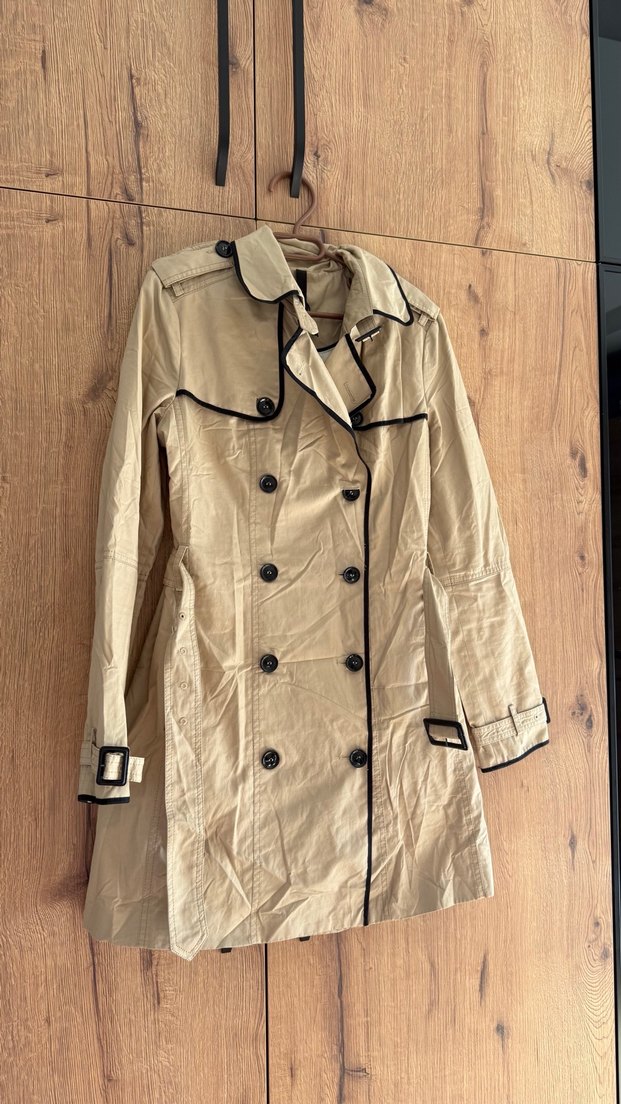 Bej renkli, düğmeli ön ve kesik yaka detaylı midi trençkot. Uzun kollu, siyah dikiş detaylı, düz kesim ve sentetik kumaştan üretilmiştir. Mango markadır. Etiketi üstünde hiç giyilmedi. Vintage tarza da çok uygundur.