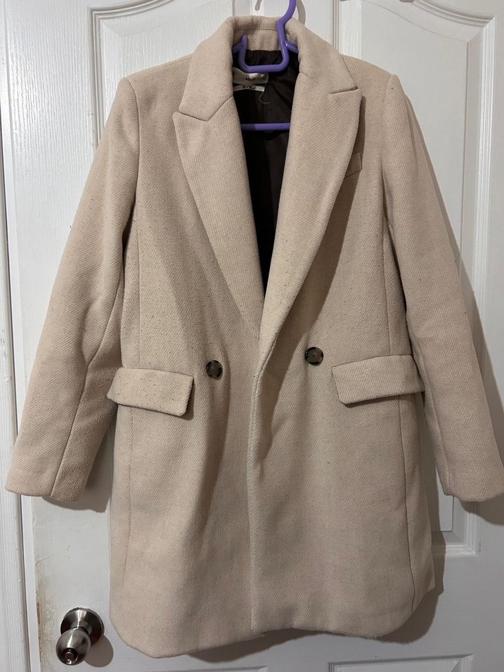 Bej renkli süet kumaştan yapılmış, normal boy kadın kaban. Düğmeli, yakası kesik ve uzun kolludur, ofis kullanımı için uygundur. Paris tarzı ve normcore stilini yansıtır. Herhangi bir deformesi yoktur.