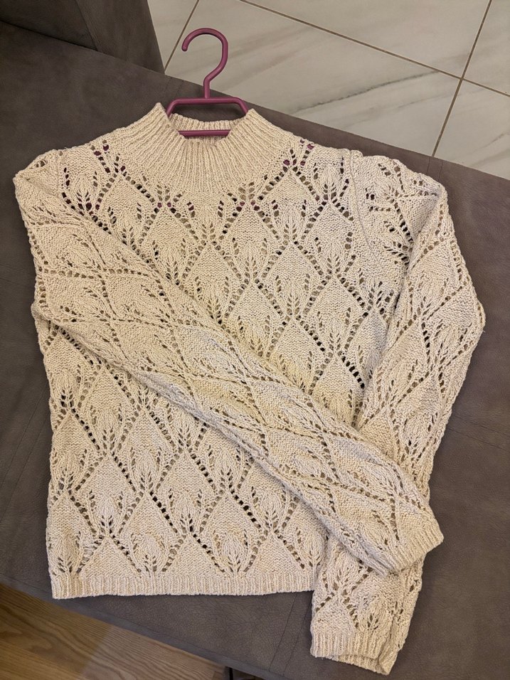 Bej renkte, örme kumaştan, bohem tarzda, uzun kollu ve balıkçı yaka kadın kazak. Rahat kesimi ve örgü detaylarıyla günlük kullanıma uygundur. Bedeni xs ama small beden de rahatlıkla kullanabilir.