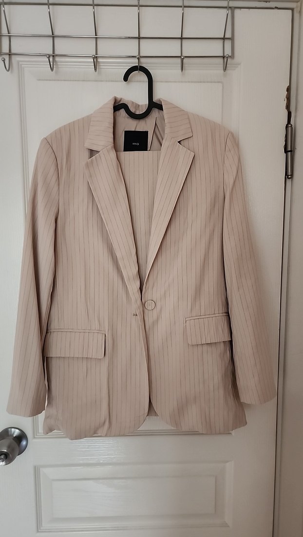 Mango Bej Çizgili Kadın Blazer Ceket ve Pantolon Takım Oversize