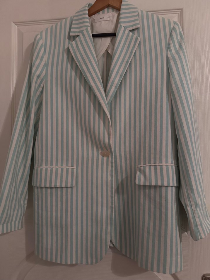 MANGO Bej Çizgili Midi Kadın Blazer Ceket