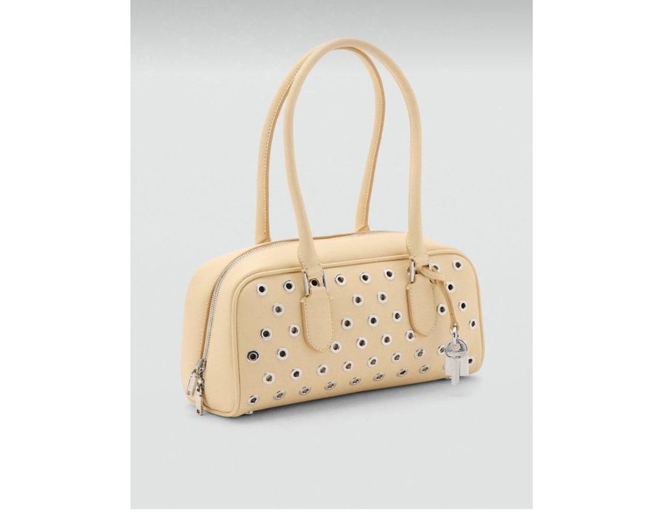 Bej deri kadın çantası, kemerli ve minimalist tasarıma sahip, günlük kullanıma uygun. Metal halkalarla çağdaş bir görünüm sunar.