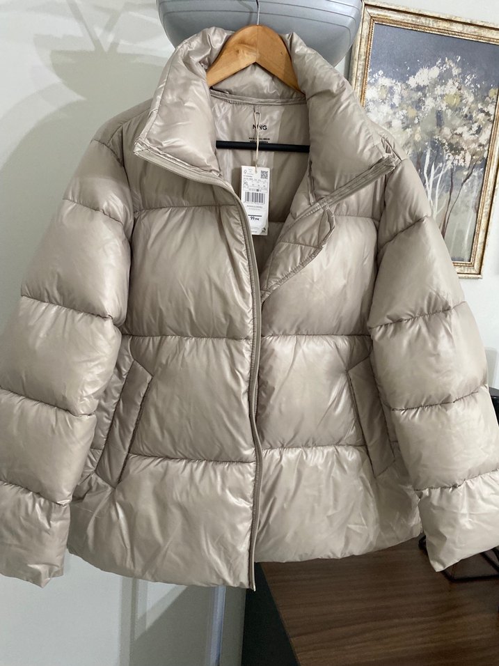 Mango Bej renkli, kesik yakalı kadın kışlık mont. Bol kesim, uzun kollu ve yumuşak sentetik kumaştan günlük kullanım için uygun. ❄️ su itici kumaştır.