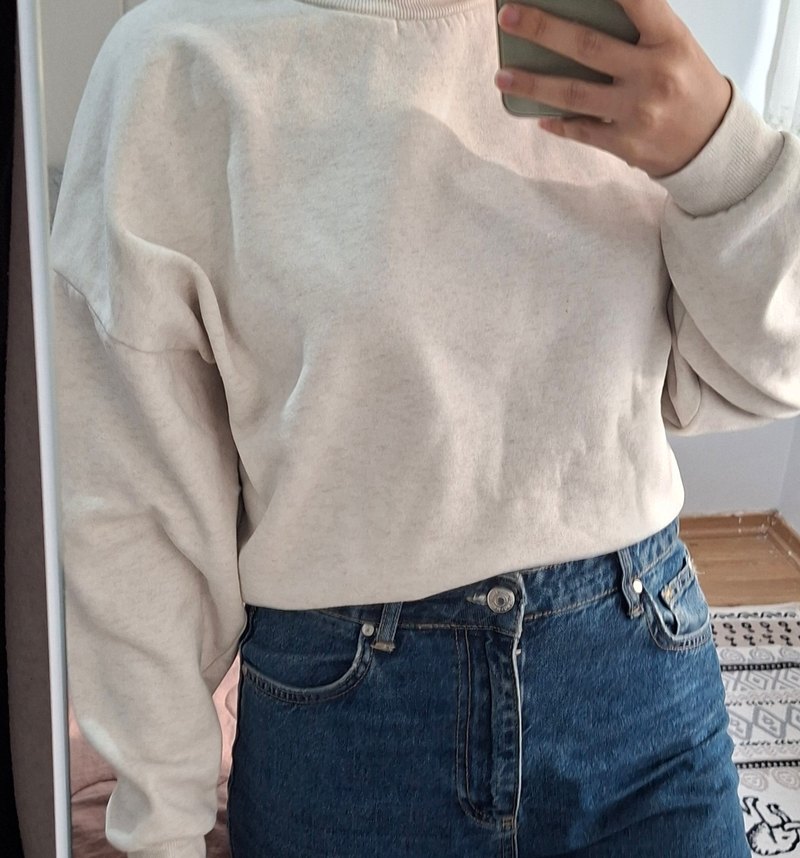 Bej renkli, bisiklet yaka ve uzun kollu kadın sweatshirtü. Denim kumaştan, rahat kesim ve normal boyda, gündelik kullanıma uygun şık ve rahat bir model.