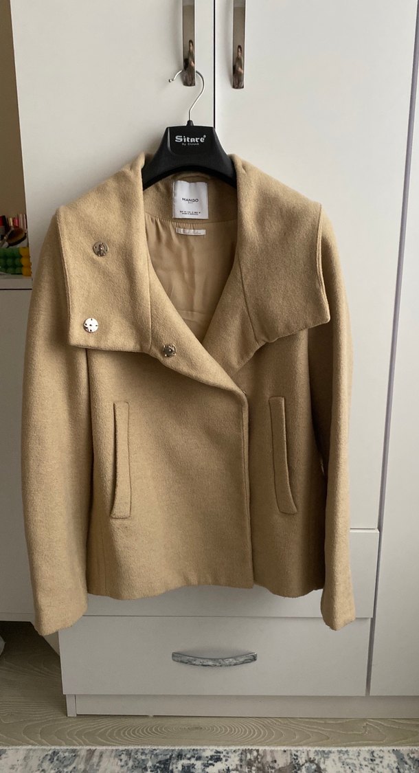 Mango marka geniş yakalı, ön cepli bej kısa kaban, yumuşak ve sıcak tutan kumaştan üretilmiştir.