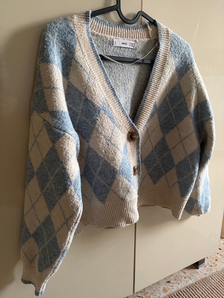 MANGO Bej Mavi Baklava Desenli V Yaka Triko Hırka - Görsel 1