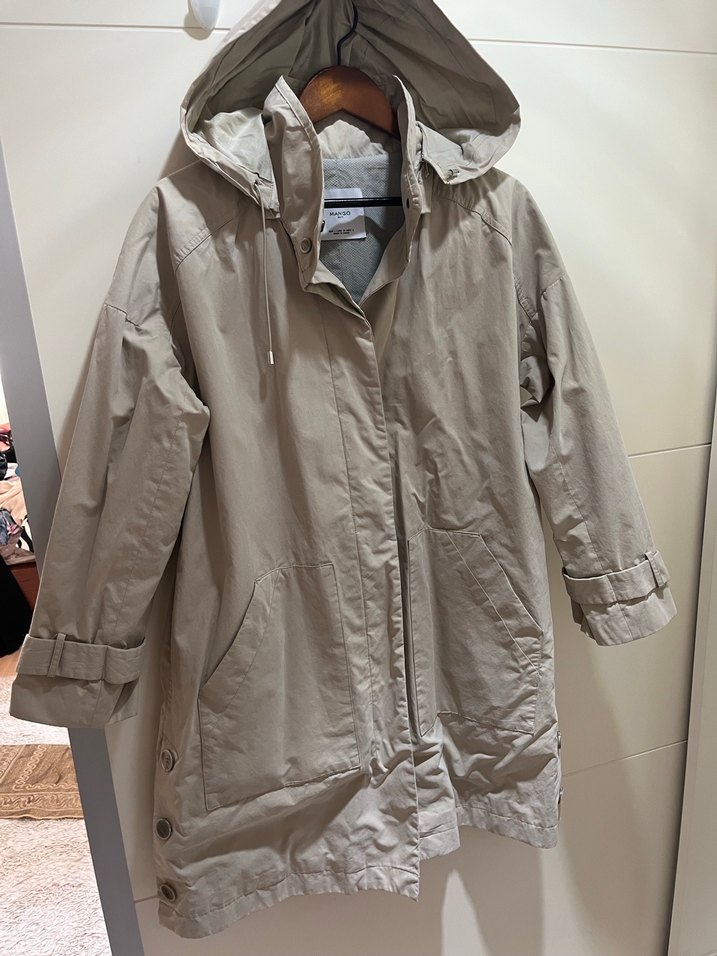 Mango Suit marka Bej renkli, kapüşonlu midi kadın yağmurluk, bol kesim ve uzun kolludur. Düğmeli ön kapama ve çentikli yaka detayına sahiptir. Kapşonu takılıp çıkarılabilir. Günlük sokak stili için uygundur. ️