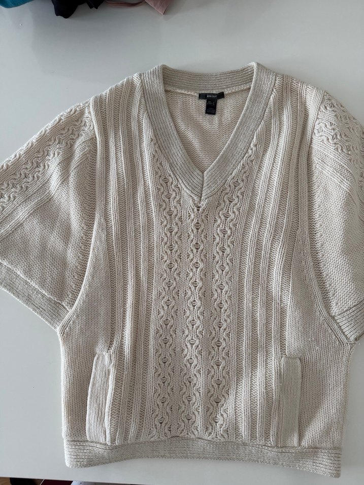 Bej renkli, örgü kumaştan yapılmış kadın süveter. V-yaka ve kısa kollu, bol kesim rahat bir kullanım sunar. Günlük kullanıma uygun.