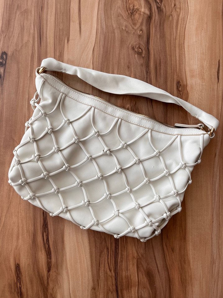 Beyaz deri kadın çanta, ağ detaylı ve yumuşak askılıdır. Bir kaç küçük patlağı var detaylı ekledim onın dışında vintage görünümlü kol altı çantası içine baya bir şey sığıyor kitap su vs alır
