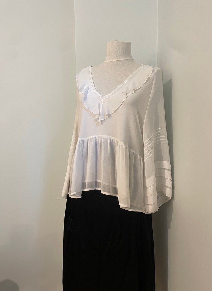 Beyaz polyester bluz, V yakada fırfır detaylı ve uzun kollu. Bol kesim ve önü arkasından biraz daha kısa. Halter yaka şeklinde astarı mevcut. Kusuru yok. İki koltukaltı arası 45, önü 55, arkası 60 cm