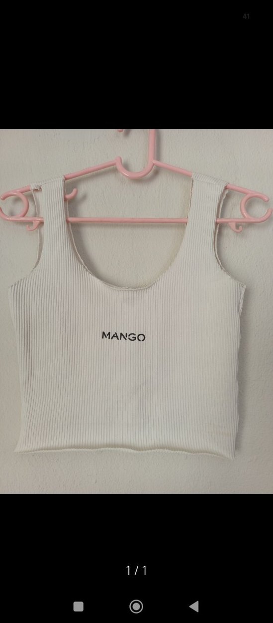 Beyaz triko kumaştan, MANGO yazılı, minimal kesim ve tekne yaka, günlük kullanıma uygun, rahat ve şık kadın atlet.