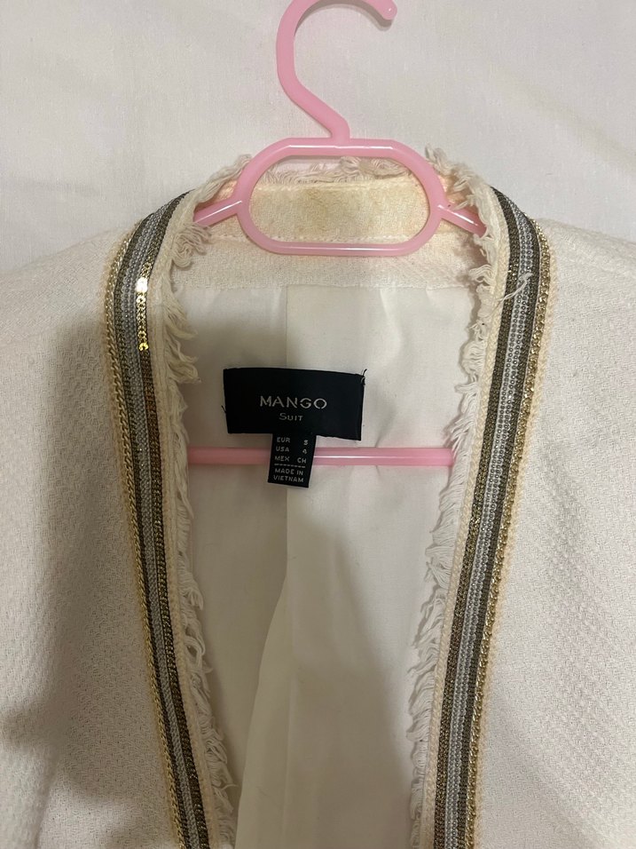 Mango'dan beyaz, sentetik kumaştan yapılmış, fermuarlı ve baskılı desenli, strappy kollu, normal boy midi kadın ceket. Şık Paris tarzı için ideal.