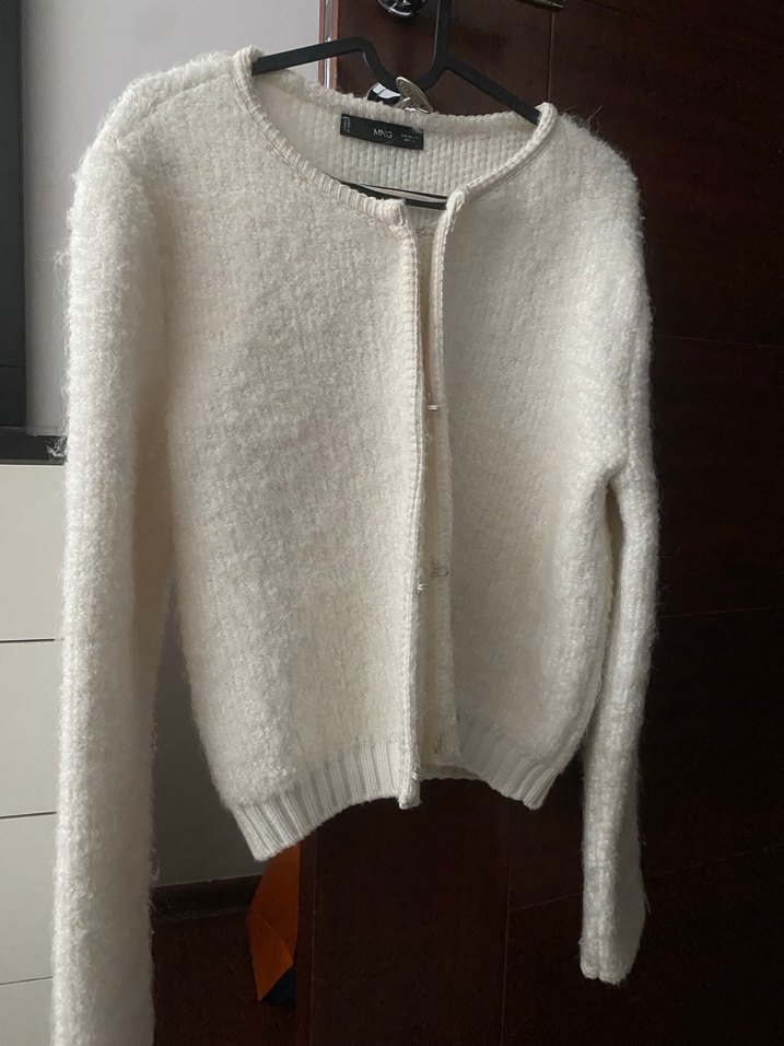 Beyaz renkli, örgü kadın hırka, uzun kollu ve yuvarlak yaka, rahat ve sade görünüm sunar.