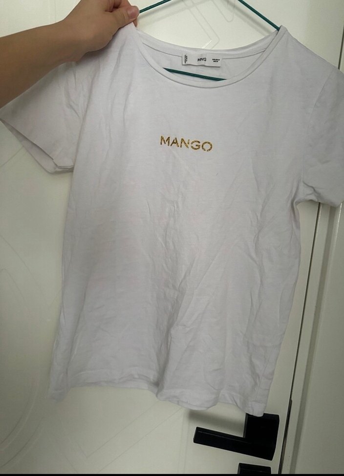 Mango marka beyaz pamuklu tişört, kısa kollu ve bol kesimdir. Ön kısmında baskılı logo bulunur, gündelik kullanıma uygundur.