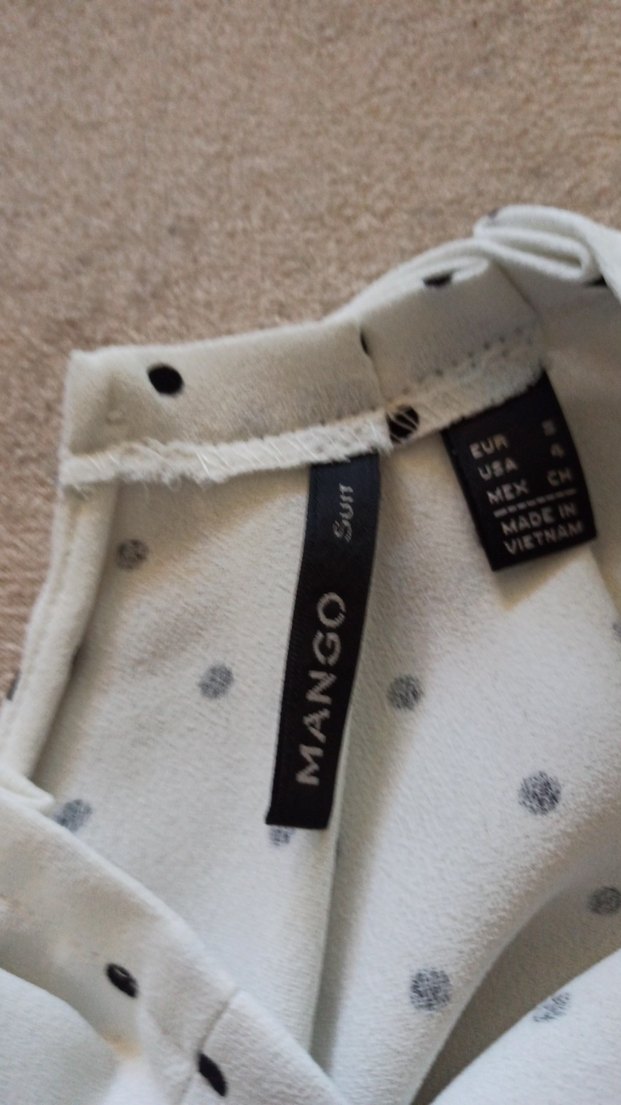 Mango marka, beyaz zemin üzerinde gri puantiyeli, düğmeli kapanışlı ve sokak stili tasarıma sahip köpek kıyafeti. USA, MEX, EUR beden seçenekleri mevcut.