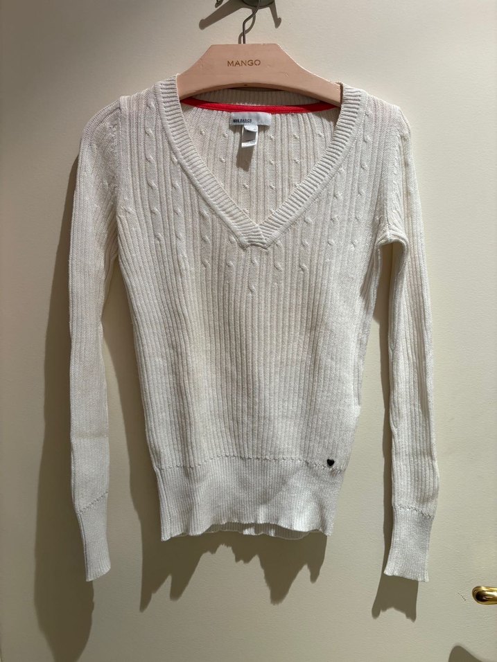 Mango marka, V yaka, uzun kollu, örgü kumaştan yapılmış, normal boyda ve düz desensiz beyaz kadın kazak. Rahat ve şık bir görünüm sunar.