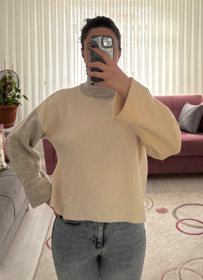 Boğazlı ve rahat kesimli kadın triko kazak, uzun kollu ve midi boyda. Açık sarı ve gri tonlarında yumuşak yün örme kumaştan yapılmıştır, gündelik kullanıma uygundur. Mango S beden