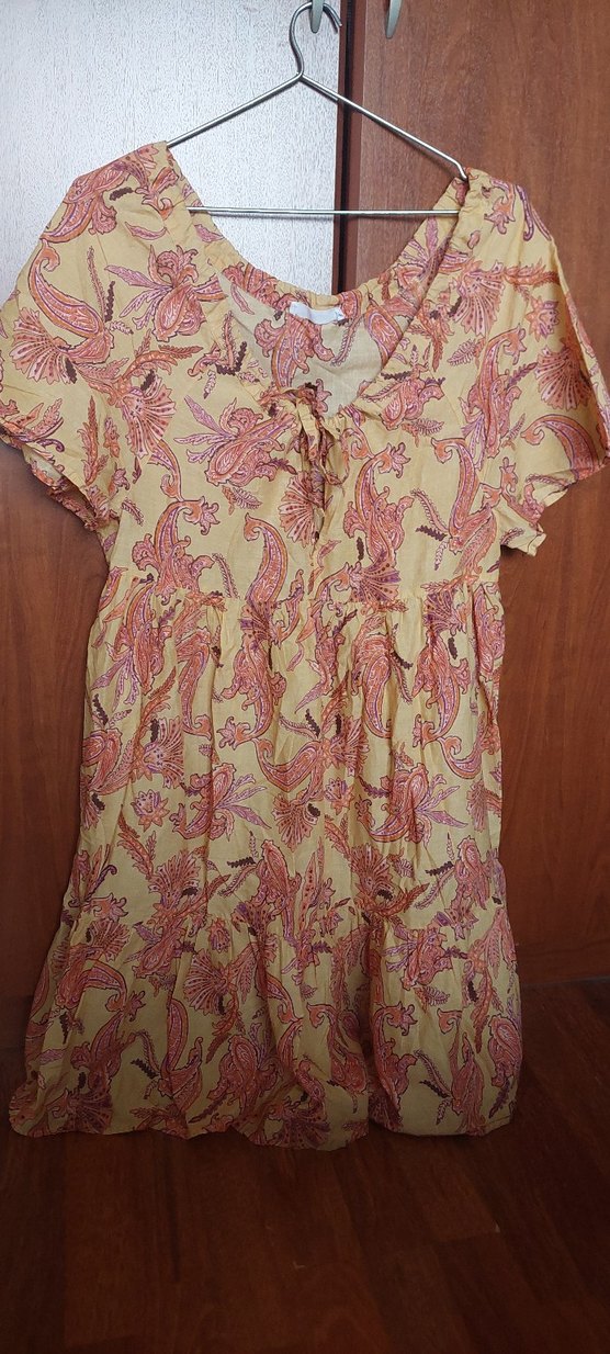 V yaka, kısa kollu, bol kesim elbise. Pastel çok renkli batik desenli ve fırfır detaylı, yumuşak sentetik kumaştan üretilmiştir.