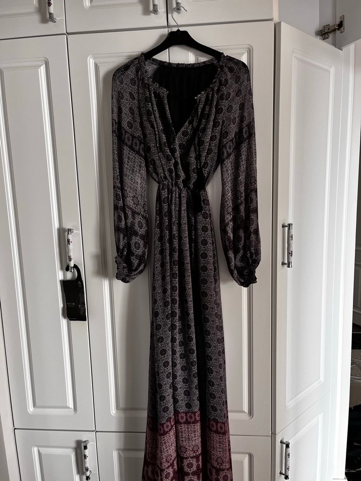 Bohem tarzda, dökümlü ve bol kesim uzun elbise. Uzun kollu ve V yakalı, sentetik kumaştan, koyu gri batik desenli, romantik akşamlar için uygun.