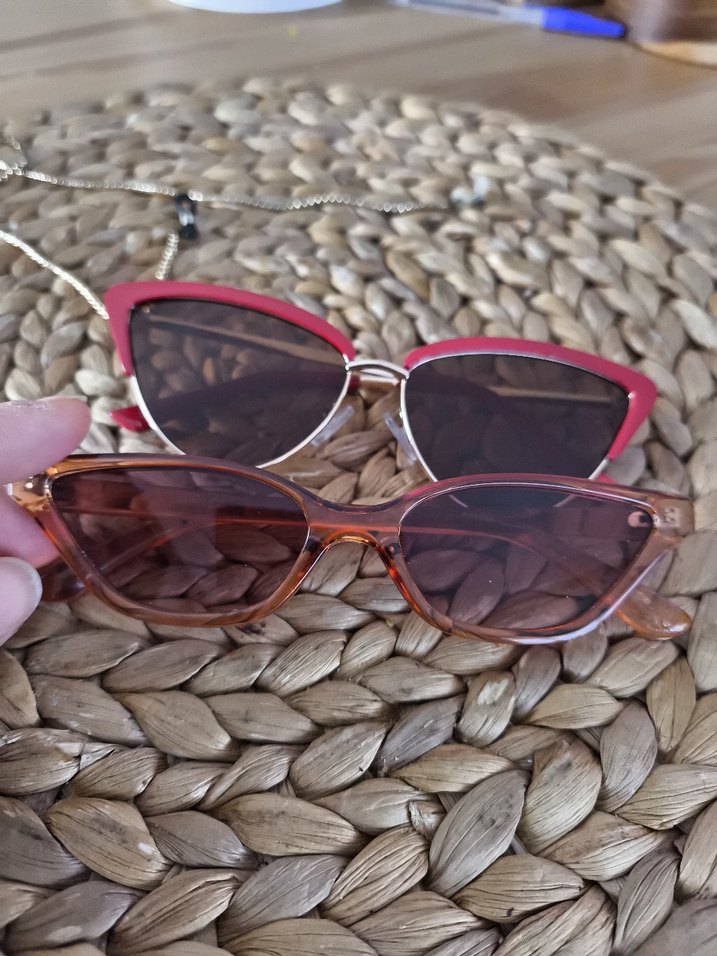 Bohem tarzda, zincir detaylı, renkli çerçeveli ve kahverengi camlı kadın güneş gözlüğü. Retro ve hippie stil için uygun. ikisi de mangoya ait. kırmızı olanda bir sıkıntı yok, turuncu olanın da sadece kulplarında biraz soyunma var, fiyat temsilidir sorunuz. ikisini alana yanında mangonun metal gözlük ipini hediye edeceğim