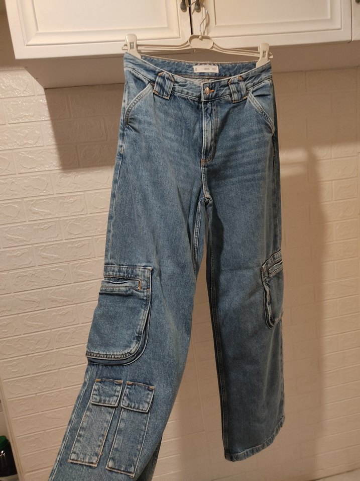 bol kesim midi kot pantolon, cep detaylarıyla günlük rahat kullanım için uygun. Düz mavi kumaş sokak stilini yansıtıyor. bedeni 36dir bir kaç kez bile giyilmedi sıfıra yakındır salaş bir pantolon