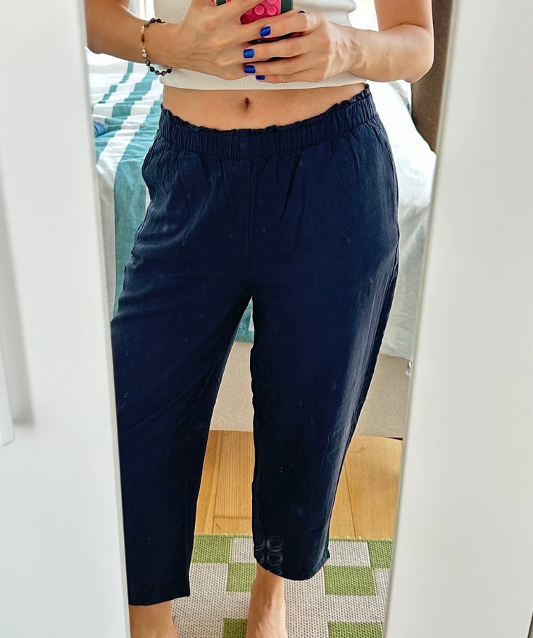 Koyu mavi renkte, bol kesim ve midi boyda denim pantolon. Günlük kullanıma uygun, rahat ve şık bir tasarım.