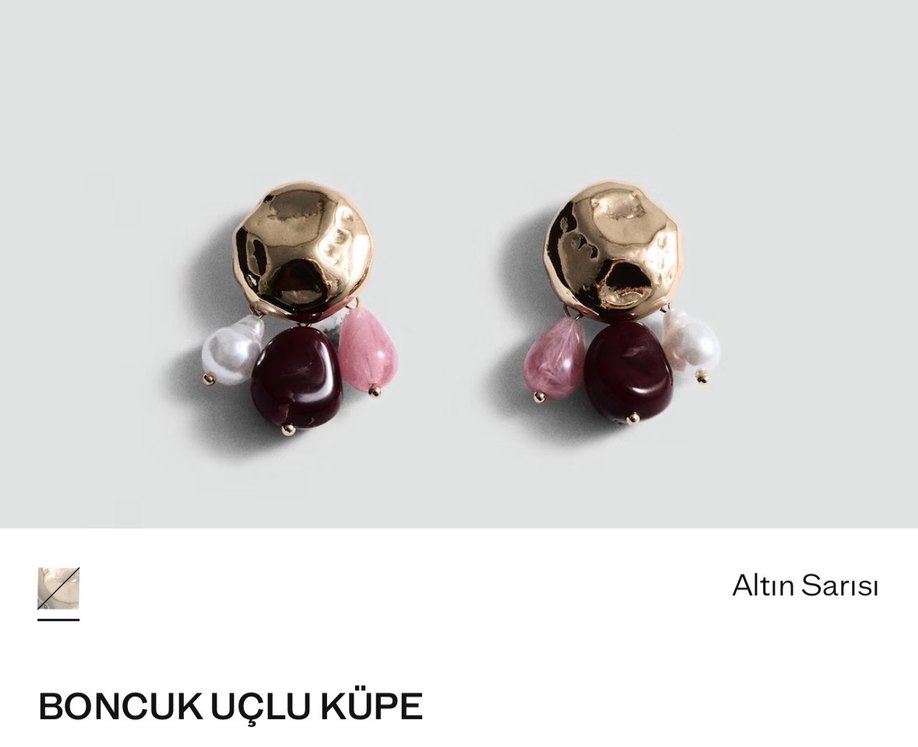 Altın tonlu üst kısmı ve bordo-pembe boncuklarıyla çağdaş, desenli midi küpe. Parisli avangart tarzına uygun, romantik akşamlar için ideal.