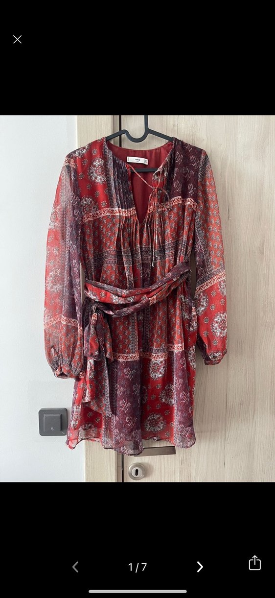 Xs Bordo tonlarında bağlama detaylı, bol kesim, midi boy bohem elbise. Uzun, transparan kollar ve bel bağlama özelliği bulunur.
